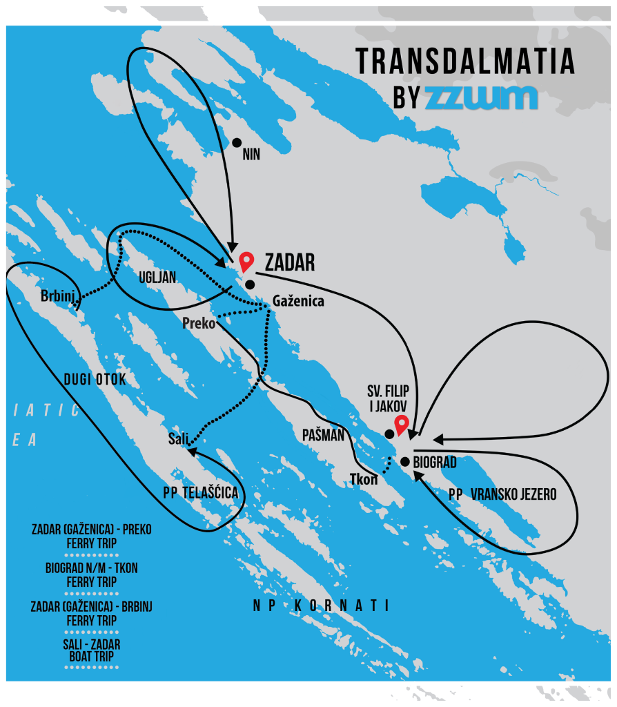 The trail begins in Zadar, a city rich in heritage and sea views. From here, the route leads north to Nin, a town of royal history and salt fields, before returning to Zadar. Crossing by ferry, you reach Ugljan and ride across the island to Muline. A short hop over the bridge brings you to Pašman, where the road continues south. From Tkon, a ferry takes you back to the mainland, landing in Biograd. Just a few kilometers inland lies Lake Vrana Nature Park, a peaceful stop surrounded by a rich tapestry of birdlife and traditional Dalmatian countryside. From here, the trail returns to Zadar through the fields and vineyards of Ravni kotari.